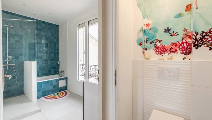 Les salles de bain des appartements du 16e et du 8e arrondissement de Paris ont été rénovées pour allier fonctionnalité et élégance. Chaque salle de bain a été équipée de douches à l’italienne avec des carreaux de céramique, rappelant les nuances de la mer et ajoutant une touche de sérénité. Des baignoires intégrées offrent un espace de détente luxueux, parfait pour se relaxer après une longue journée.