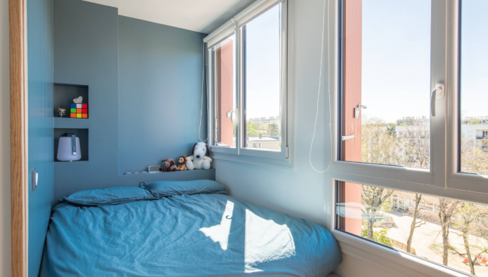 Lors de la rénovation des chambres, l'accent a été mis sur la création d'une ambiance sereine et relaxante. Les murs ont été peints dans des tons doux et neutres pour favoriser une atmosphère calme et sereine. Un mur d'accent dans chaque chambre ajoute une touche de couleur et de caractère, qu'il s'agisse de bleu profond, de mousse vert ou de chaud gris. Cette approche permet de personnaliser chaque espace tout en maintenant une cohérence visuelle avec le reste de l'appartement.